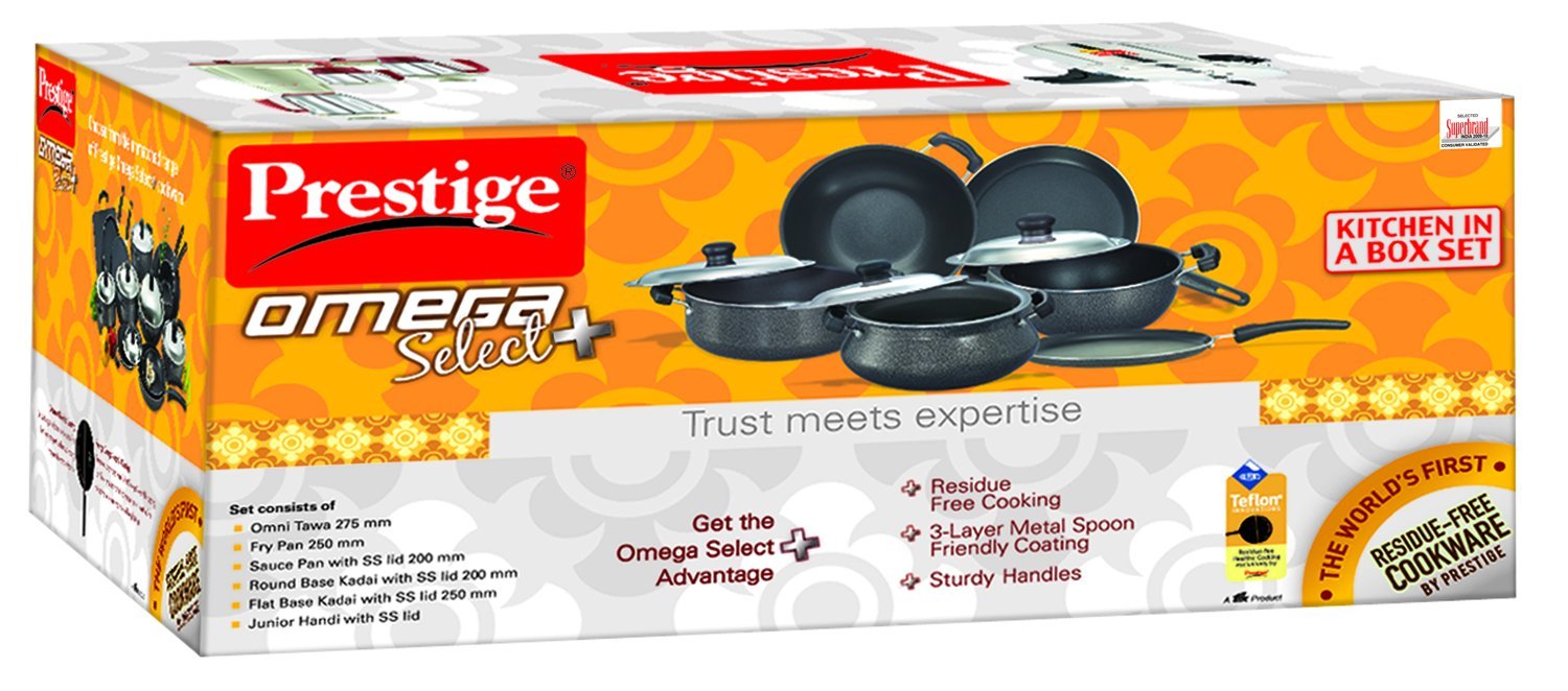 - Package contents: 1 Omni tawa - 275 mm, 1 Fry pan - 250 mm, 1 Sauce pan with SS lid - 200 mm, Round base kadai with SS lid - 200m, 1 Flat base Kadai with ss lid - 250 mm, 1 junior Handi with ss lid